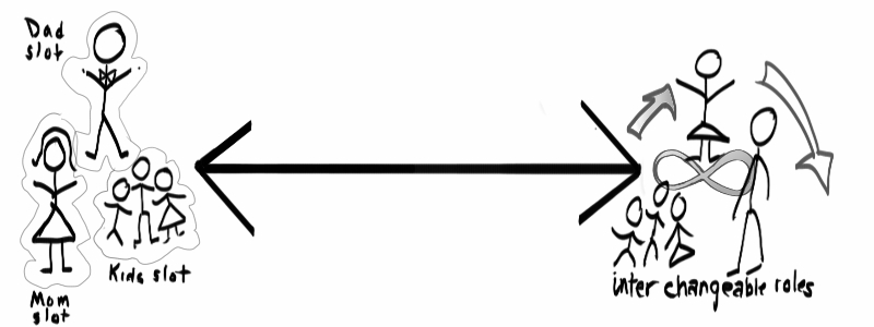 Can you give us an example of something you do that indicates how fixed or how interchangeable your approach to roles is?  A story about following expectations?  Or contradicting expectations?  Or when you became aware that your idea about "how __________(mother/father/other roles) should behave" was different from the place you found yourself in?